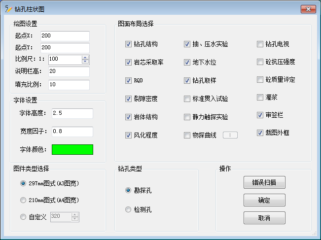 (4)钻孔柱状图自动生成:该模块基于 Visual C#语言采用 ActiveX 技术对 AutoCAD 进行二次开发,完成了柱状图的自动绘制,克服了传统手工绘制钻孔柱状图普遍存在的成图慢、效率低、难以满足实际生产的需要等缺点。在绘制柱状图时,通过调用岩性图例库, 对柱状图进行填充处理,实现自动生成;在处理岩性描述文字时采用绘制缓冲线的算法,实现岩性描述文字与对应岩性符号层位自动,调整高度,避免了岩性描述文字过多而带来的层间互相重叠并使绘制出来的图形能够真正符合编写实际地质生产报告的需求。